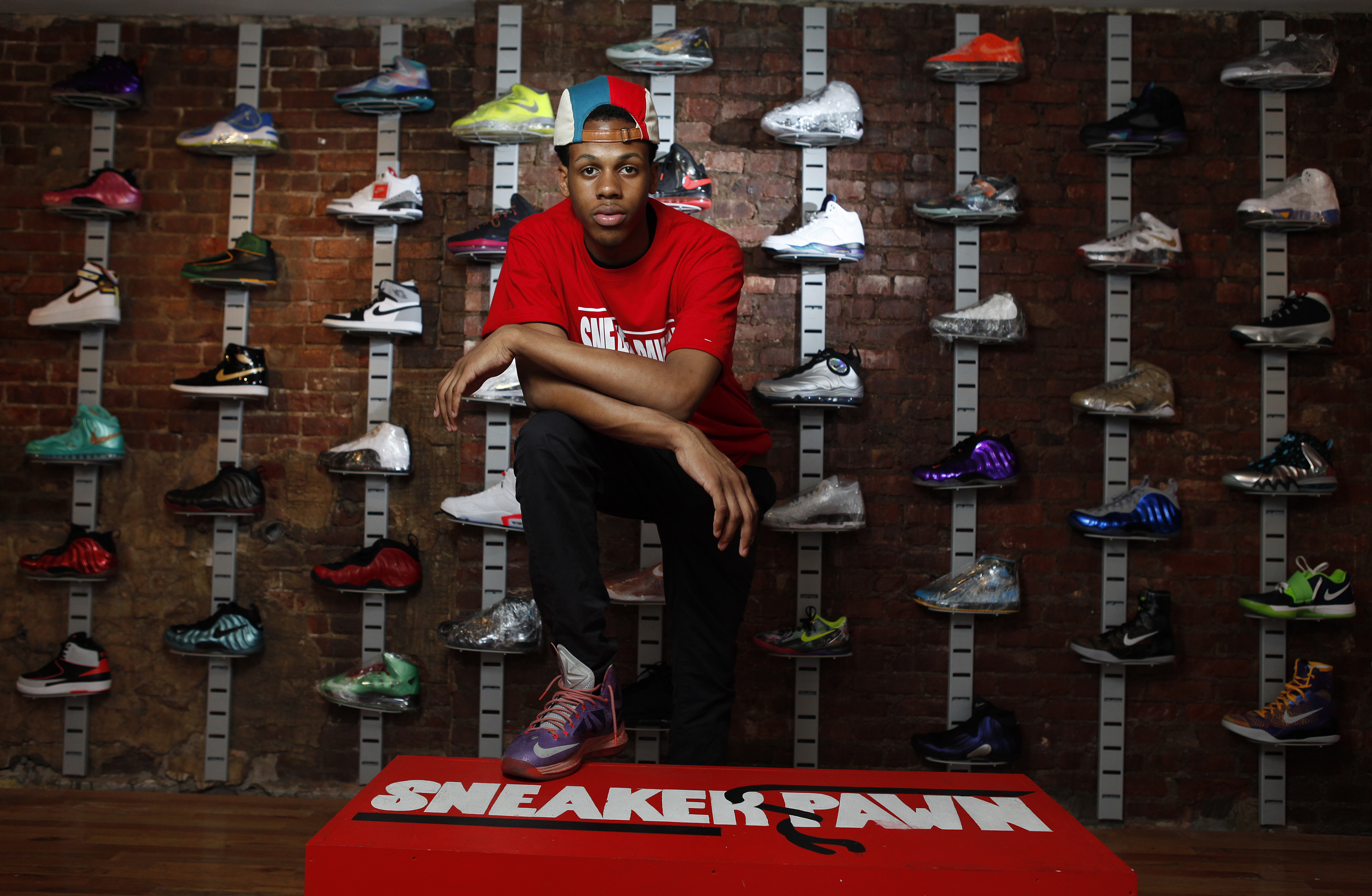 0611Sneakers01CHE.JPG Published August 21, 2014 at 3060 × 1998 in CHASE REED ← Previous Next → NEW YORK – FOR SUNDAY NEWS: Chase “Sneakers” Reed, 15, inside of his Sneaker Pawn shop and consignment store at 200 Lenox Ave, Manhattan, NY, Wednesday, June 11, 2014. PICTURED: (Angel Chevrestt, 646.314.3206)