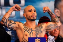 Boxer Miguel Cotto flexes his muscles as he stands on a scale during a weigh-in, ahead of his fight against Austin Trout in New York, November 30, 2012. Cotto will fight Trout on Saturday at Madison Square Garden. REUTERS/Keith Bedford (UNITED STATES – Tags: SPORT BOXING) – RTR3B2GG