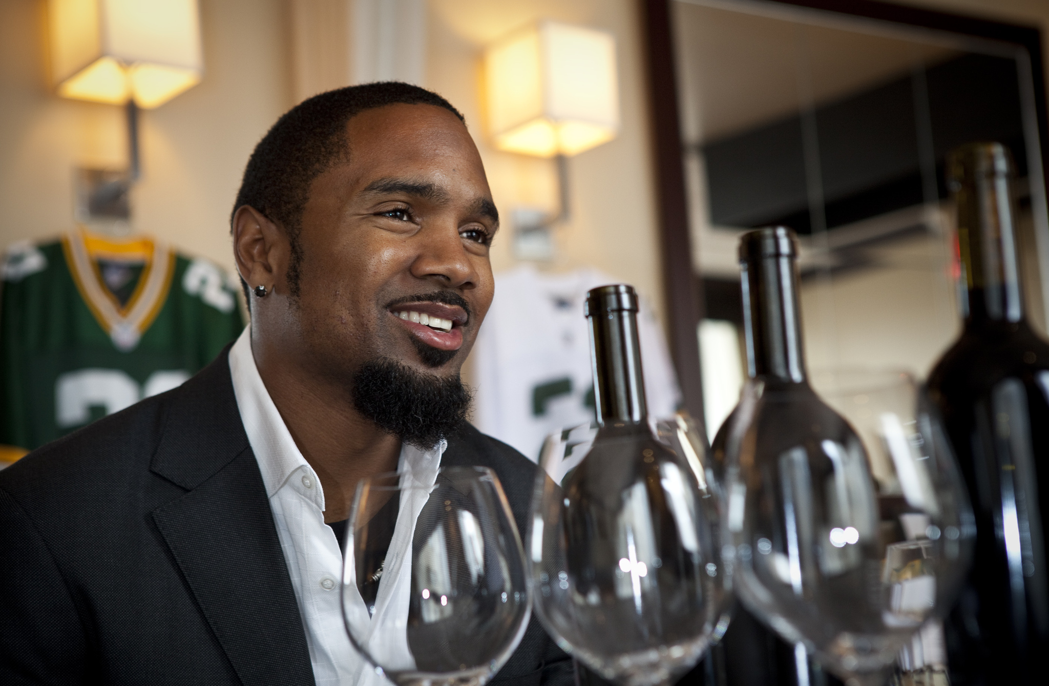 schacol01, fea, lynn, 2.-Green Bay Packer and winery owner Charles Woodson with a few bottles of his wine talks about how he became interested in wine Thursday April 14, 2011 at Bacchus-A Bartolotta Restaurant. Photo by Tom Lynn/TLYNN@JOURNALSENTINEL.COM